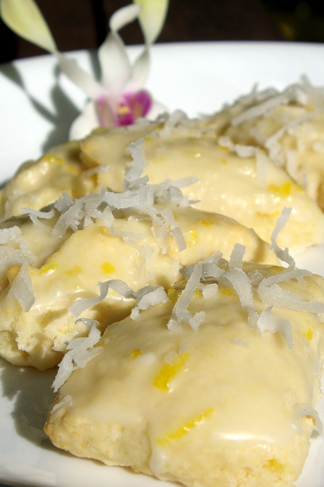 While the scones are still warm dip the tops in the glaze and sprinkle with a little more coconut.
