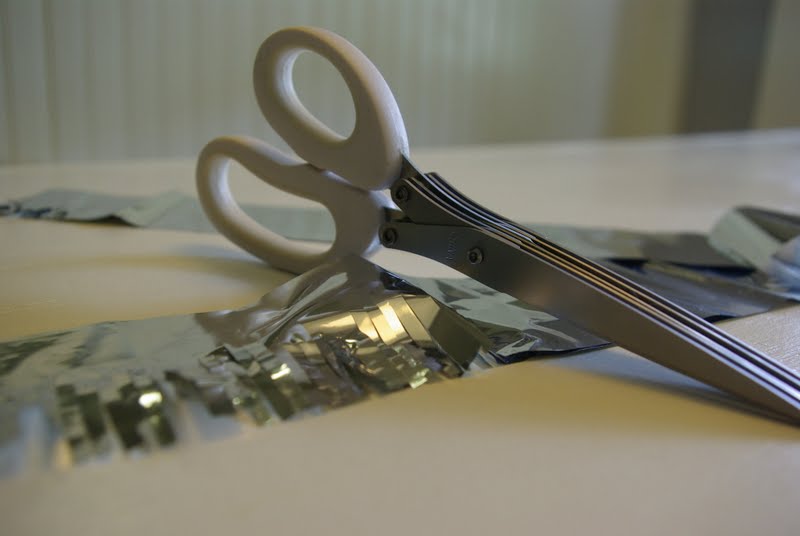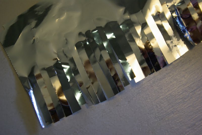 I covered this pinata with silver foil tissue paper.  To give it the fringed look I used Martha Stewart’s fringing scissors from Michael’s.  I cut 2 inch strips of the foil paper and then fringed one side of it.  Starting at the bottom on the pinata, I hot glued the strips on in layers.