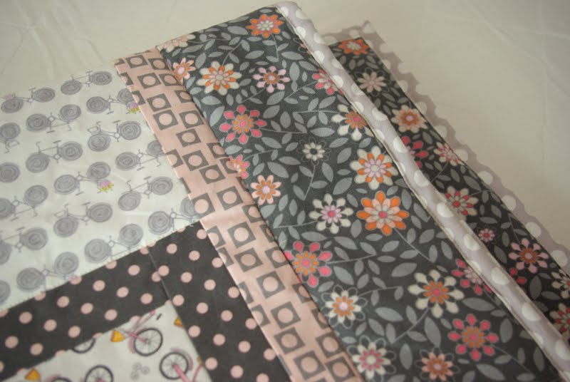 The back of the quilt is a really fun grey and white polka dot. I would like to do the crib skirt in it, but I am having trouble finding anymore of that fabric.