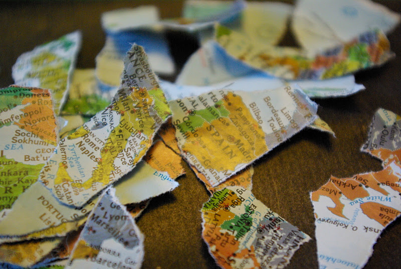 These a super simple. I bought the paper ornament forms at Michaels for 69 cents each. For one ornament I used a California road map and the other I used the Europe part of an old wall map from school. Choose maps that have meaning or significance to you. You simply tear the maps into small pieces and then in layers, attach them to the ornament with Mod Podge until the entire surface is covered. Once they are dry I covered both with clear crystal glitter.