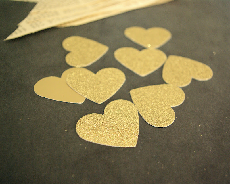 Here’s what you need: pages from an old book, cotton twine, hearts cut out of glittered paper, and a glue stick.
