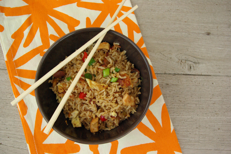 This one of the recipes that really has morphed from other recipes over the years.  I’ve been making it this way for at least 12 or more years.  Now I’m not sure where it began, but here’s my take on fried rice.  It’s got some ingredients that you might not be familiar with (like Maggi Seasoning and Chinese Five Spice), but it’s pretty low in fat, quite healthy, and definitely tastey.