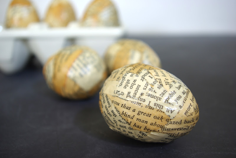 I used Mod Podge, paper mache eggs (from Michaels), and a couple vintage books from a thrift store. I chose 3 different books to use because they had varying shades of cream and tan and I liked the effect that this gave.