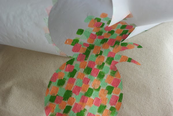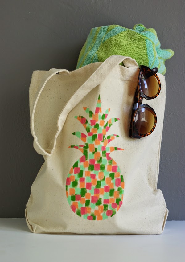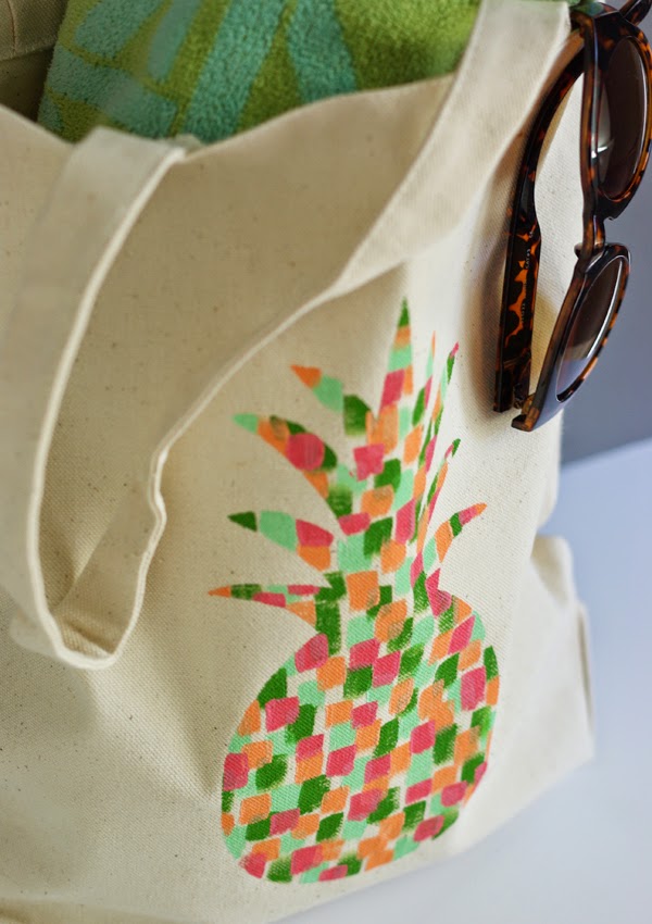 So great, right? A nice clean line. The freezer paper really makes a great seal for your stencil. Put a small sheet of parchment paper over the painted pineapple shape and iron to set the color (about 1 min.) Now your bag is ready to head to the beach or pool and if it gets dirty, no worries, just throw it in the wash!